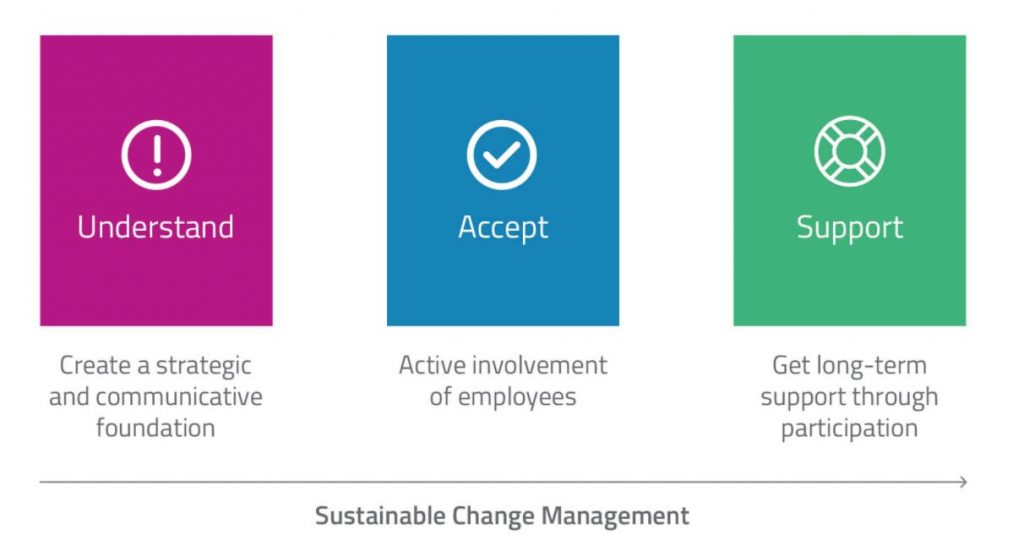 En un mundo moderno caracterizado por la volatilidad, la incertidumbre, la complejidad y la ambigüedad (VUCA), los empleados y las empresas están bajo una presión constante para cambiar. Solo aquellos que estén dispuestos a lidiar con modelos comerciales disruptivos y soluciones innovadoras tienen la oportunidad de mantener una posición exitosa en el mercado. Sin embargo, esta presión a menudo resulta en decisiones prematuras y una compulsión para realizar cambios que no crean un valor agregado notable para una organización o sus empleados. Son proyectos como estos los que a menudo causan aversión y falta de confianza en los cambios, lo que a su vez puede generar rechazo y temores que pueden tener un gran impacto en el éxito de un proyecto.